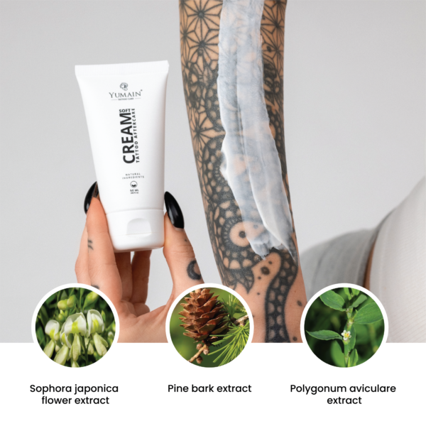Apply Yumain Cream to a clean, tattooed area. Before application, gently cleanse your tattoo with Yumain Cleanser. Use the Cream whenever the tattoo feels dry. Massage it gently onto the area in circular motions. For skin regeneration, apply 2-3 times a day, using a small amount on the tip of your finger.